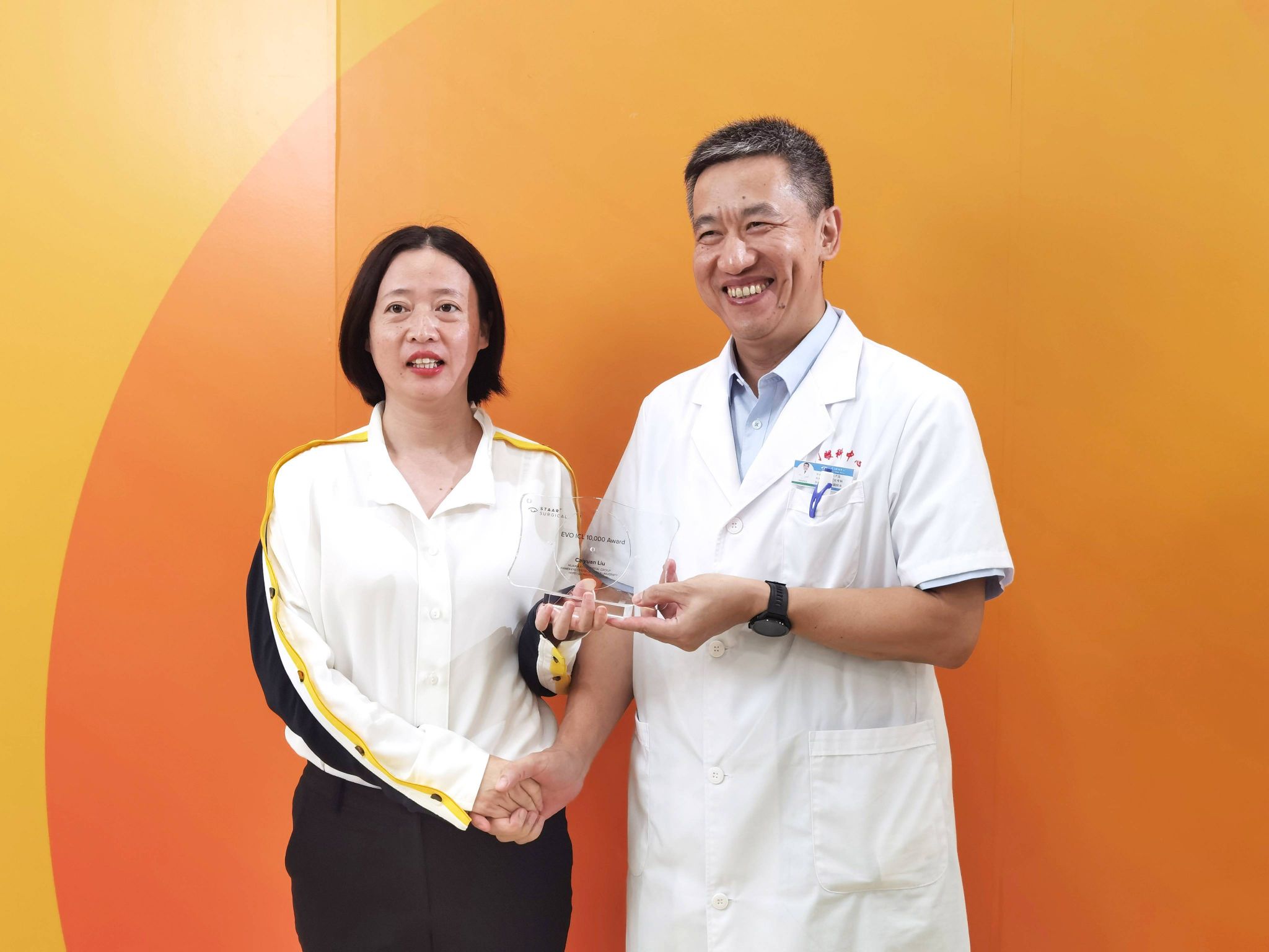 9月22日下午,EVO ICL官方研發(fā)機(jī)構(gòu)STAAR Surgical公司代表為廈門眼科中心業(yè)務(wù)副院長、ICL核心專家委員會(huì)首屆委員劉才遠(yuǎn)教授頒發(fā)了『EVO ICL 10000 例』獎(jiǎng)?wù)?,以表彰其ICL晶體植入量正式突破10000例。