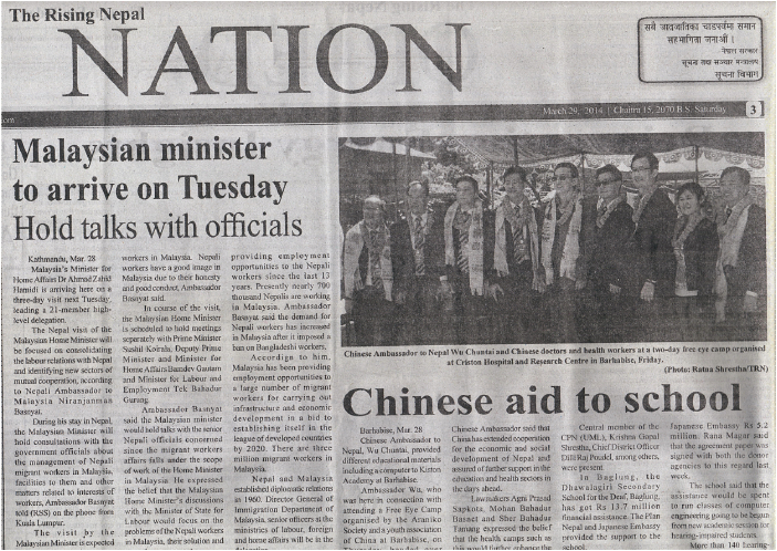 3月29日晚,中華人民共和國(guó)駐尼泊爾特命全權(quán)大使吳春太先生及夫人宴請(qǐng)光明行全體成員。他在宴會(huì)上發(fā)表熱情洋溢的講話。吳大使說(shuō),這次尼泊爾光明行很有意義,中尼兩國(guó)是友好鄰邦,兩國(guó)交往歷史淵源流長(zhǎng)。這次光明行在尼泊爾北部山區(qū)的巴勒比斯舉行,這里民風(fēng)淳樸,對(duì)中國(guó)有著友好的感情,但是這個(gè)地區(qū)由于道路所限,缺醫(yī)少藥,特別是一些老年人患有白內(nèi)障,所以這一次光明行,對(duì)于促進(jìn)兩國(guó)人民友誼,特別是解除白內(nèi)障患者的痛苦具有特殊意義。另外一方面,我們之所以選擇巴勒比斯,是因?yàn)樗侵心嵊押弥钒⒛岣绻匪?jīng)過(guò)的一個(gè)重要城市,這里見證了兩國(guó)人民的千年交往史。中國(guó)政府鼓勵(lì)兩國(guó)人民開展民間友好交往,我們現(xiàn)在的外交更加積極更加全面。去年中央召開了周邊外交工作座談會(huì),明確提出要進(jìn)一步加強(qiáng)與周邊國(guó)家的友好關(guān)系,貫徹親、誠(chéng)、惠、容的新的外交理念,鼓勵(lì)民間交往。這次活動(dòng)體現(xiàn)了中央針對(duì)周邊國(guó)家外交工作的思想,體現(xiàn)了民間外交的理念。