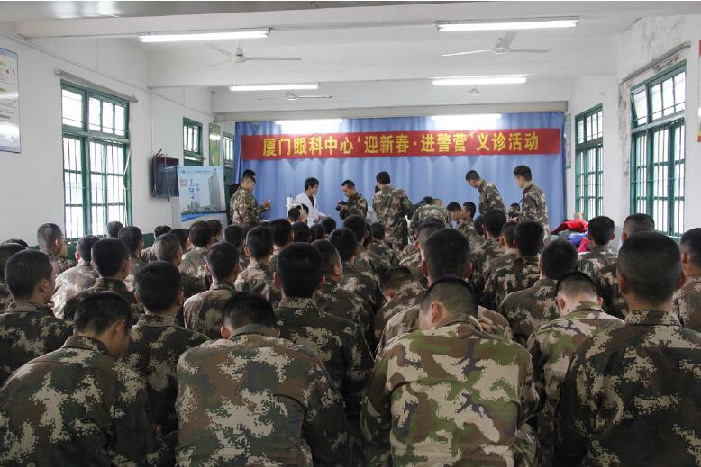 1月29日下午,廈門眼科中心眼表與角膜病專家一行9人冒著冬雨到翔安武警邊防支隊(duì)機(jī)動(dòng)大隊(duì),開展“迎新春 送健康”健康咨詢、義診活動(dòng),并為邊防支隊(duì)武警贈(zèng)送了進(jìn)口眼藥水。廈門眼科中心以實(shí)際行動(dòng)提前為武警邊防支隊(duì)致以新春祝福與問候,并送去了健康。義診現(xiàn)場(chǎng)氣氛十分熱烈,義診從下午三點(diǎn)半一直持續(xù)到下午六點(diǎn),為近百名武警做了眼體檢。
