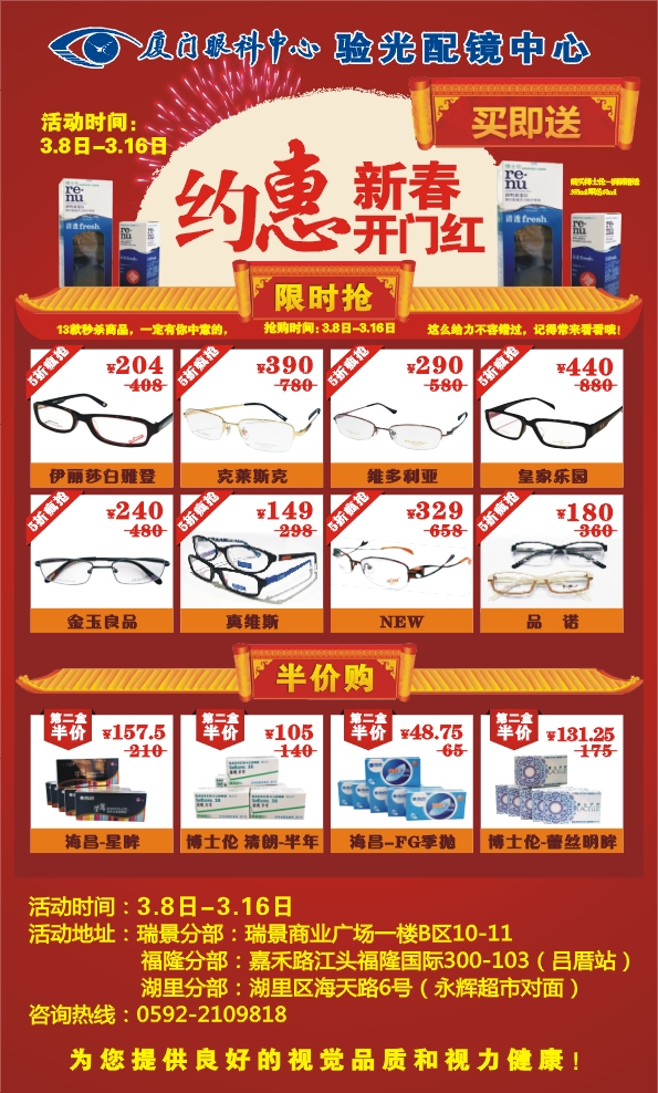 【文章導(dǎo)讀】【活動時間】3.8日-3.16日 【活動內(nèi)容】 1、推出八款高檔光學(xué)鏡框:伊利莎白雅登、維多利亞、真維斯、NEW、品諾、金玉良品、克萊斯克、皇家樂園,5折優(yōu)惠! 2、同時推出4款隱形眼鏡