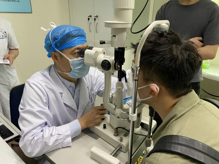 ▲廈門眼科中心屈光科執(zhí)行主任揭黎明為龍峰做術(shù)前檢查