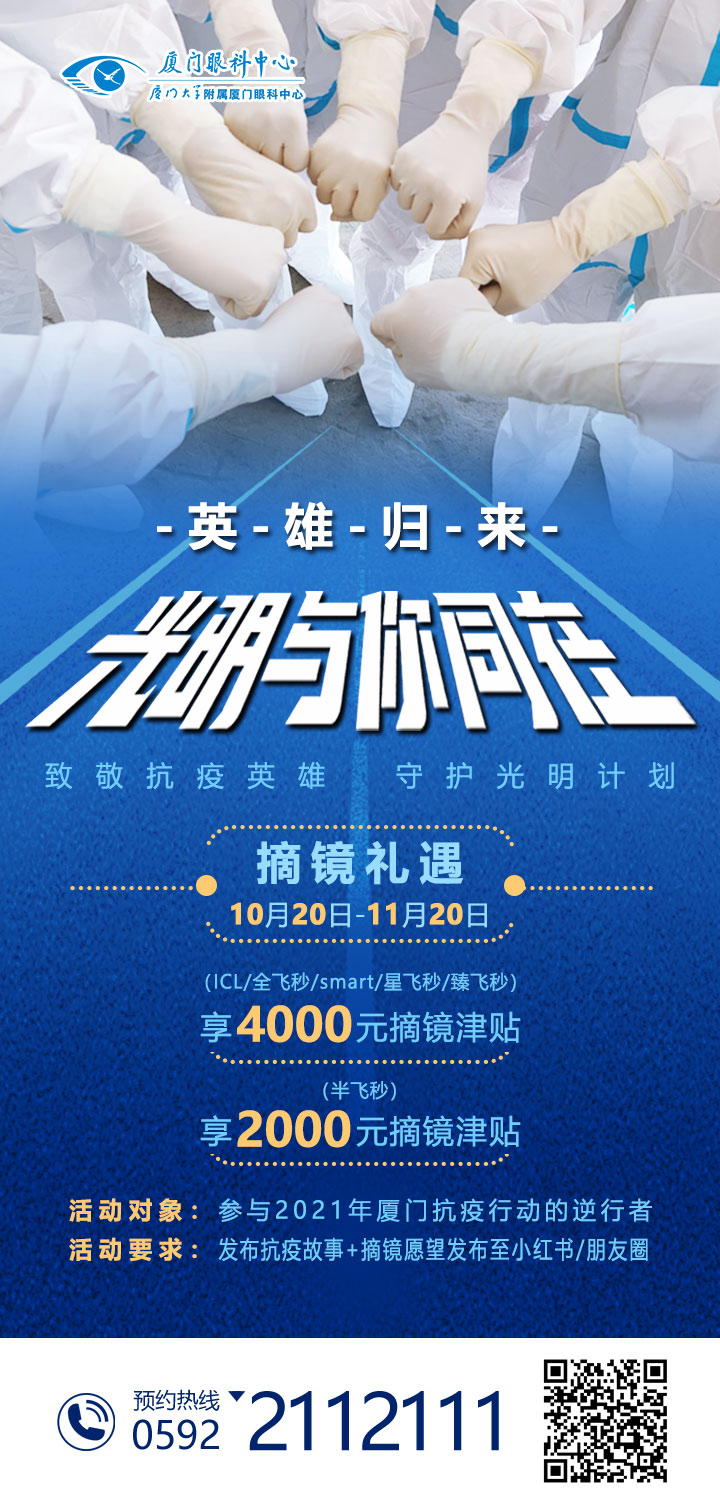 幸得有你,山河無恙。為表達對抗疫逆行者的崇高敬意,用愛回饋、致敬一線抗疫人員,廈門眼科中心將于10月20日—11月20日推出“致敬抗疫英雄 守護光明計劃”摘鏡優(yōu)惠活動。