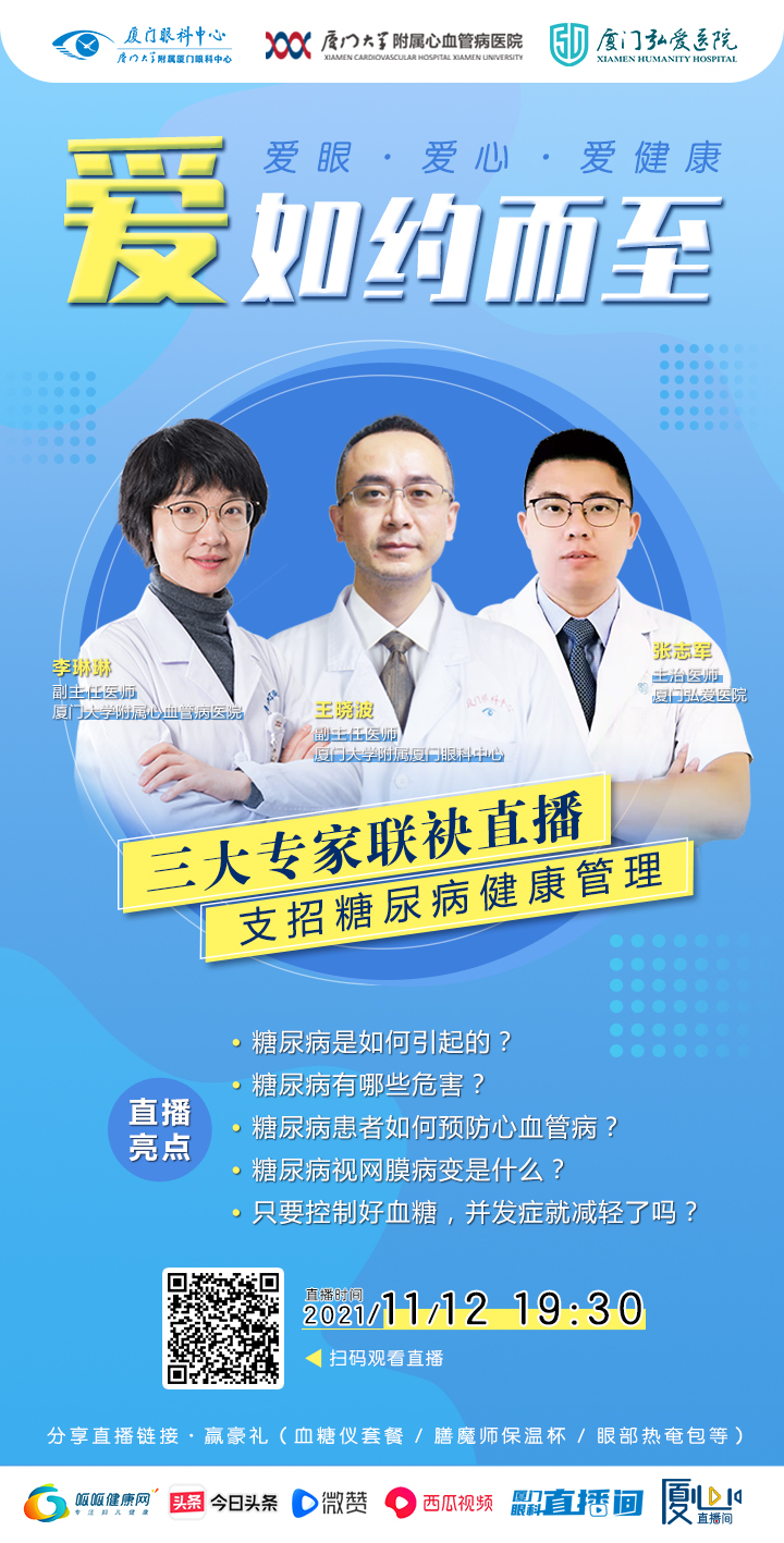 11月12日(周五)晚19:30,廈門(mén)大學(xué)附屬?gòu)B門(mén)眼科中心攜手廈門(mén)大學(xué)附屬心血管病醫(yī)院、廈門(mén)弘愛(ài)醫(yī)院共同開(kāi)展聯(lián)合國(guó)糖尿病日大型公益直播活動(dòng)。