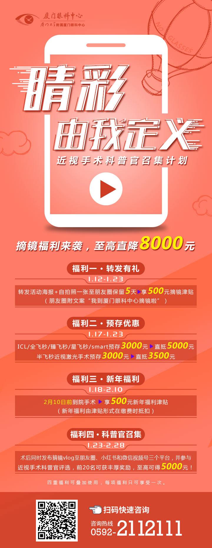 轉(zhuǎn)發(fā)活動海報+自拍照1張+附帶話題#我要去廈門眼科中心摘鏡啦#,發(fā)布至朋友圈保留5天,即可獲500元摘鏡津貼。(注:每少保留1天優(yōu)惠減少100元)