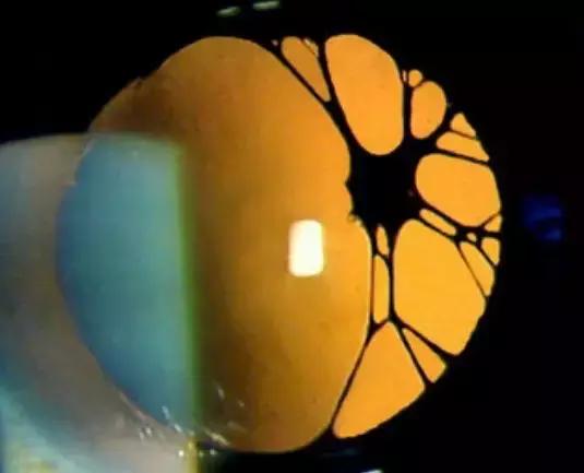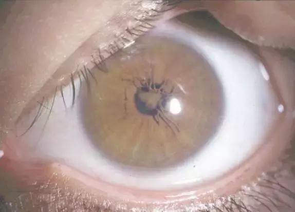 ?、粜停簹埬こ噬貭钣坞x于前房,或呈細(xì)線狀一端附著于虹膜小環(huán),一端游離于前房內(nèi)。