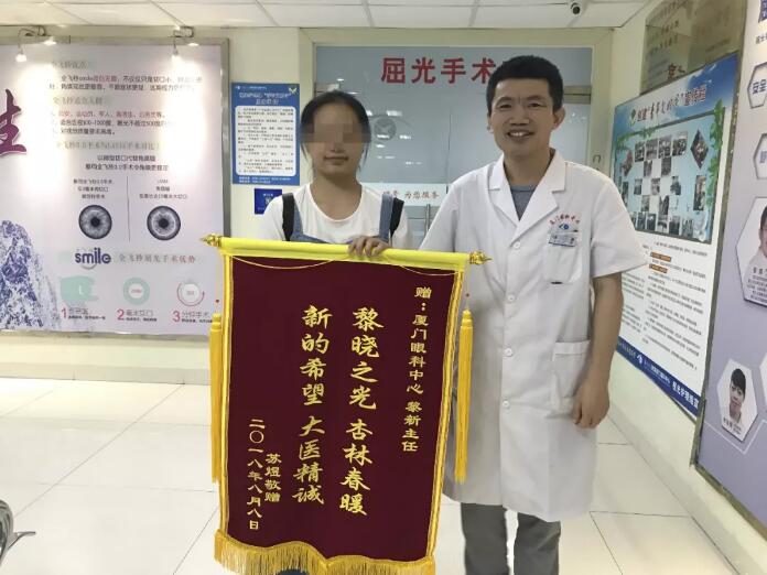 “克服內(nèi)心的恐懼不容易,幸好有黎新主任耐心引導(dǎo),讓我擺脫內(nèi)心的恐懼,成功摘鏡眼鏡,我非常非常感謝黎新主任。”雙眼視力已矯正到1.2的小蘇懷著無比激動的心情說。為了表達(dá)自己的感激之情,她還特意給黎主任寫了詩、感謝信、贈送錦旗。