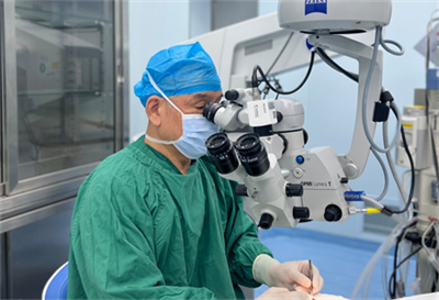 第二天,王大爺進入手術(shù)室,由吳護平院長操刀再次進行右眼的角膜移植手術(shù)。這次手術(shù)做的穿透性角膜移植,由于是二次移植,要考慮到移植片大小、中心等多方面因素,需要在取出原有的角膜植片后,再將完整健康的角膜組織縫合固定上去,十分考驗主刀醫(yī)生的經(jīng)驗和專業(yè)技術(shù)。