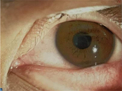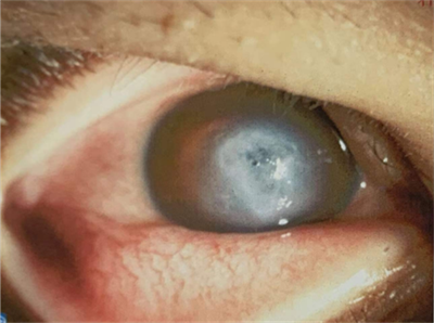 小森的右眼就是角膜變薄導(dǎo)致角膜內(nèi)層結(jié)構(gòu)破裂,角膜出現(xiàn)水腫,視力驟降,屬于急性圓錐角膜發(fā)作。商旭敏博士接診時(shí),距離小森發(fā)病已過(guò)去了2天,他的右眼角膜已呈現(xiàn)肉眼可見(jiàn)的白色。