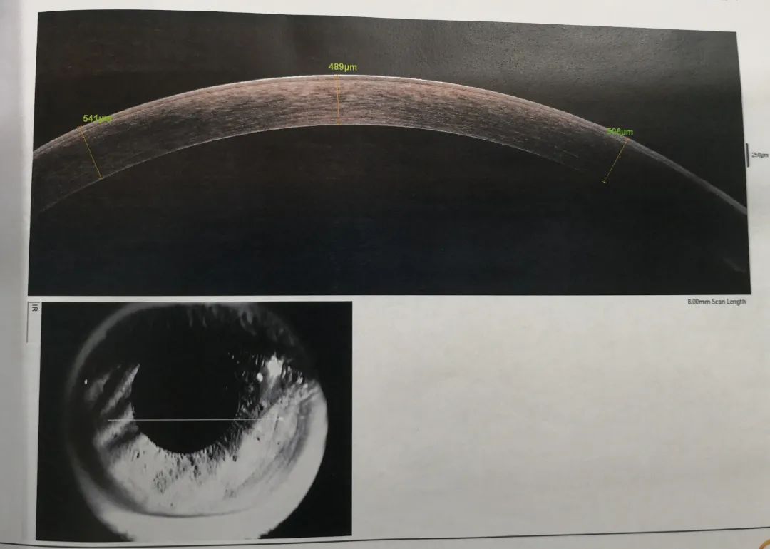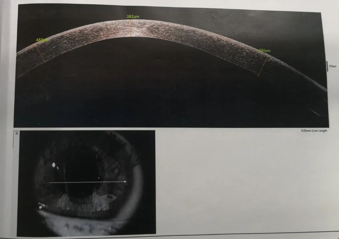 小雨重新回憶起之前的診治經(jīng)歷,確定此前的檢查中并沒有圓錐角膜的檢查,羅順榮副主任為她完善了相關(guān)檢查。檢查結(jié)果顯示,小雨左眼還是圓錐角膜初期,但右眼已經(jīng)是圓錐角膜的完成期,左眼角膜厚度為489μm,而右眼僅剩下382μm。