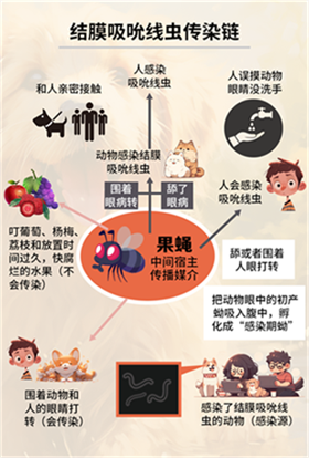 至于家中有養(yǎng)寵物的也不必擔心,結(jié)膜吸吮線蟲蟲源在傳播過程中需要果蠅作為“中間者”,野外動物感染結(jié)膜吸吮線蟲一般是因為果蠅在“食用”這些動物眼部分泌物的過程中,將蟲源傳播到這些動物的眼睛里,從而導致感染,所以大家不必因為家中寵物而擔憂,定期驅(qū)蟲即可。