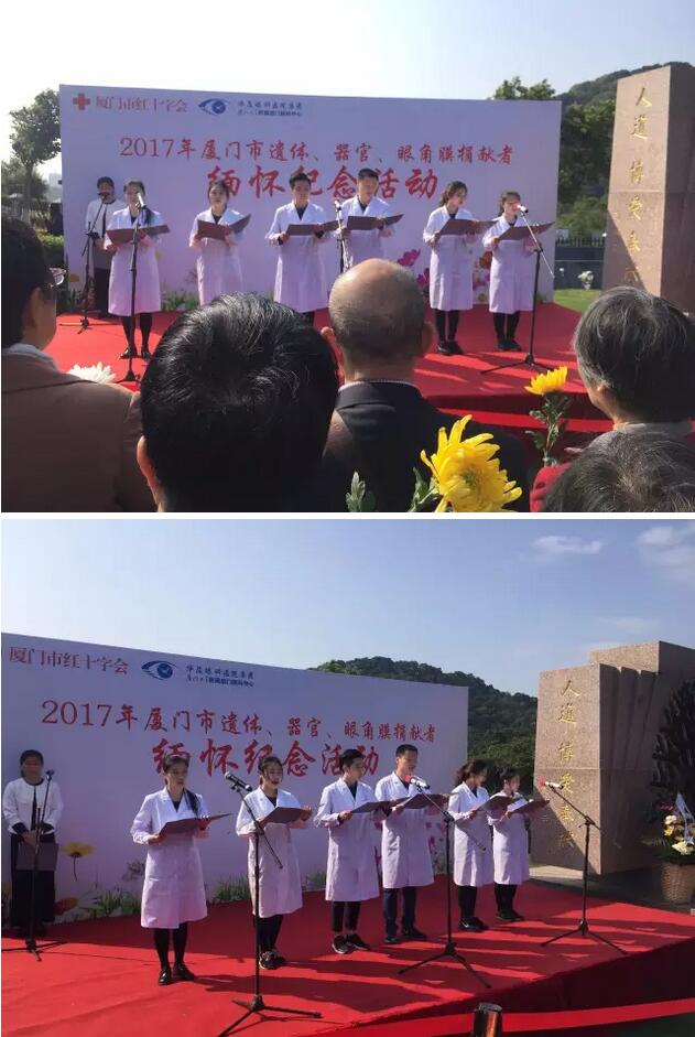 活動(dòng)中,廈門大學(xué)附屬?gòu)B門眼科中心醫(yī)務(wù)工作者們帶來(lái)了《生命的禮物》的詩(shī)朗誦表演,表達(dá)了對(duì)捐獻(xiàn)者無(wú)償獻(xiàn)出珍貴“生命禮物”的崇敬與感恩之情。廈門大學(xué)醫(yī)學(xué)院青年志愿者協(xié)會(huì)在紀(jì)念碑前宣誓并遞上了獻(xiàn)花。捐獻(xiàn)者紀(jì)念碑前,手捧白菊的人群中,有蹣跚而行的白發(fā)老人,有一臉稚氣的年幼孩童,更多的是中年人和青年人。人群中,有人哭泣,有人默默佇立,一遍遍撫摸著刻在紀(jì)念碑上親人的名字。