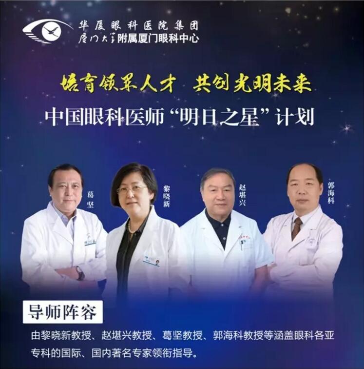 中國眼科醫(yī)師“明日之星”計劃由廈門大學附屬廈門眼科中心總院長、國際眼科科學院院士、中華醫(yī)學會眼科學分會原主任委員、北京大學人民醫(yī)院原副院長黎曉新教授,華廈眼科醫(yī)院集團專家委員會主席、國際眼科科學院院士、亞太地區(qū)斜視與小兒眼科學會副主席、中華醫(yī)學會眼科學分會前任主任委員、中國醫(yī)師協(xié)會眼科醫(yī)師分會會長趙堪興教授,華廈眼科醫(yī)院集團戰(zhàn)略發(fā)展與學術(shù)委員會主任、中華醫(yī)學會眼科學分會名譽主任委員、原中山大學中山眼科中心主任暨眼科醫(yī)院院長葛堅教授,中華醫(yī)學會眼科學分會專家會員、華廈眼科醫(yī)院集團業(yè)務副總院長、廈門大學附屬廈門眼科中心業(yè)務院長、上海和平眼科醫(yī)院院長郭??平淌诘冉倜T士、博士研究生導師組成強大的導師陣容。