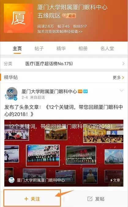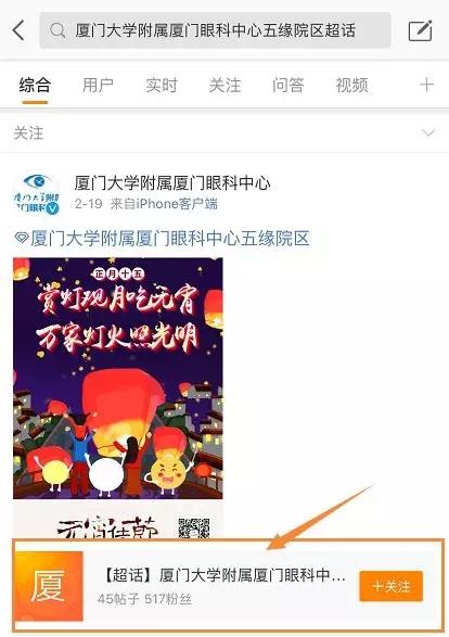 ?、俅蜷_(kāi)新浪微博,點(diǎn)擊“發(fā)現(xiàn)”,搜索“廈門大學(xué)附屬?gòu)B門眼科中心五緣院區(qū)”;