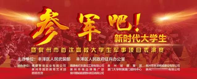 2019年5月25日,由泉州市豐澤區(qū)人民武裝部,豐澤區(qū)人民政府征兵辦公室主辦,廈門大學(xué)附屬廈門眼科中心協(xié)辦的《參軍吧!新時代大學(xué)生暨泉州市首次高校大學(xué)生軍事項(xiàng)目表演賽》在泉州市豐澤廣場舉行。表演賽吸引了泉州師范學(xué)院,泉州黎明職業(yè)大學(xué),福建電力職業(yè)技術(shù)學(xué)院,華僑大學(xué)等高校學(xué)生代表團(tuán),以及市民近千人,還有網(wǎng)絡(luò)、電視等130多家媒體通過現(xiàn)場直播或在線直播形式參加。
