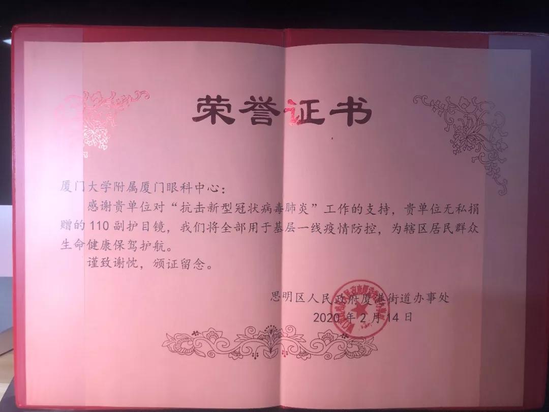 在中華街道辦,街道在LED大屏上打上了“感謝廈門大學(xué)附屬?gòu)B門眼科中心向中華街道捐贈(zèng)護(hù)目鏡”;廈港街道辦為醫(yī)院頒發(fā)了榮譽(yù)證書;還有湖里街道辦、金山街道辦等街道也寫了一封封誠(chéng)摯的感謝信。