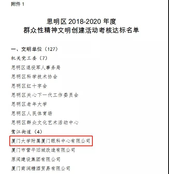 近日,中共廈門市思明區(qū)委、思明區(qū)人民政府印發(fā)《關(guān)于對(duì)2018-2020年度群眾性精神文明創(chuàng)建活動(dòng)先進(jìn)集體先進(jìn)個(gè)人進(jìn)行表?yè)P(yáng)》,對(duì)在精神文明創(chuàng)建活動(dòng)中,涌現(xiàn)出的工作扎實(shí)、成績(jī)突出、影響廣泛的的市級(jí)文明集體、個(gè)人進(jìn)行通報(bào)表?yè)P(yáng),廈門大學(xué)附屬?gòu)B門眼科中心光榮上榜。