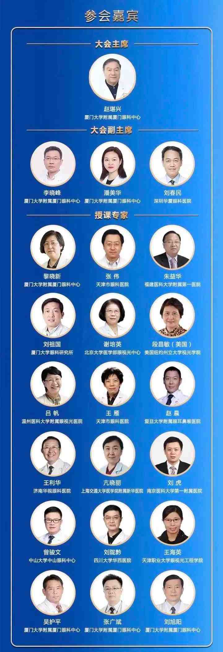 授課專家包括國際眼科科學院院士、亞太地區(qū)斜視與小兒眼科學會副主席趙堪興教授;國際眼科科學院院士、廈門眼科中心總院長黎曉新教授;中華醫(yī)學會眼科學分會斜視與小兒眼科學組組長張偉教授;中華醫(yī)學會眼科學分會眼視光學組組長呂帆教授;以及朱益華教授、劉祖國教授、王利華教授、段昌敏教授(美國)、謝培英教授、王雁教授、亢曉麗教授、趙晨教授、劉虎教授、劉隴黔教授、曾駿文教授、潘美華教授、張廣斌教授、吳護平教授、劉旭陽教授、王海英教授等重量級業(yè)界專家和講者。