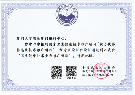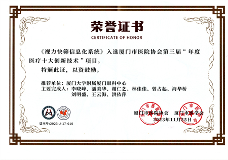 廈門眼科中心“視力快篩信息化系統(tǒng)”榮獲廈門市 “年度醫(yī)療十大創(chuàng)新技術(shù)”項(xiàng)目