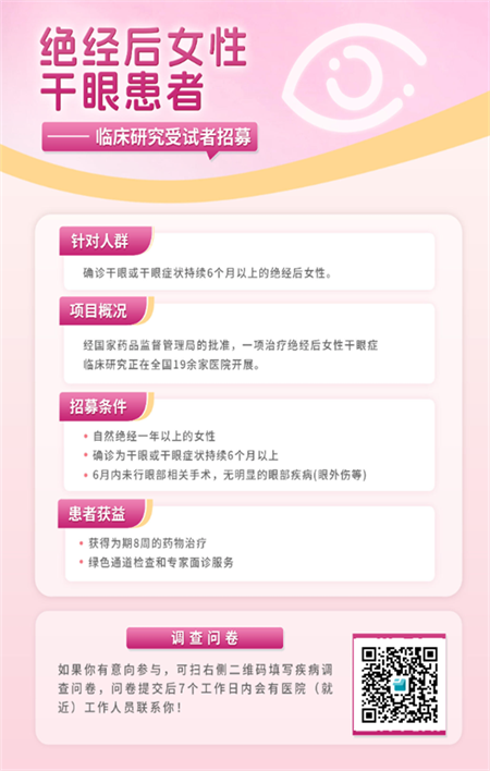 該項(xiàng)臨床研究的組長單位是廈門大學(xué)附屬眼科中心,主要負(fù)責(zé)人是劉祖國教授,針對(duì)的是確診干眼或干眼癥狀持續(xù)6個(gè)月以上的絕經(jīng)后女性。若符合招募條件,成功報(bào)名參與后您將獲得為期8周的藥物治療,以及綠色通道檢查和專家面診服務(wù)。