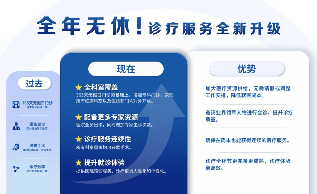 通過實(shí)施“無假日門診,診療再升級,周末開通門診”的組合方案,醫(yī)院可以在時(shí)間和服務(wù)質(zhì)量上雙重提升,確?;颊咴谌魏螘r(shí)間都能獲得高質(zhì)量的醫(yī)療服務(wù)。這不僅提高了患者的就診體驗(yàn),也增強(qiáng)了醫(yī)院的整體競爭力和服務(wù)水平,真正實(shí)現(xiàn)就醫(yī)無障礙,看病無需再請假,周末也能看醫(yī)生!