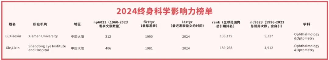 近日,美國斯坦福大學(xué)發(fā)布了第七版《全球前2%頂尖科學(xué)家榜單2024》。國際眼科科學(xué)院院士、廈門眼科中心總院長黎曉新教授、廈門眼科中心院士工作站導(dǎo)師中國工程院院士謝立信教授入選“終身科學(xué)影響力榜單”,同時與廈門眼科中心名譽院長劉祖國教授,三人共同入圍全球“2024年度影響力榜單”!