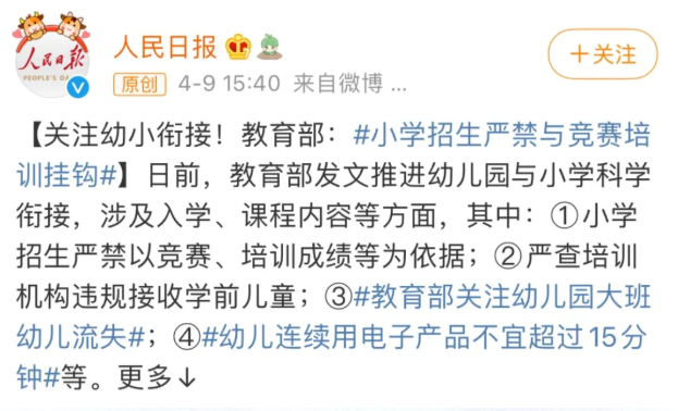 近日,人民日?qǐng)?bào)微博發(fā)布了教育部發(fā)文推進(jìn)幼兒園與小學(xué)科學(xué)銜接,涉及入學(xué)、課程內(nèi)容等方面。①小學(xué)嚴(yán)格執(zhí)行面試就近入學(xué);②幼兒園不得提前教授小學(xué)課程內(nèi)容;③幼兒園不得布置讀寫(xiě)算家庭作業(yè)……其文中特別提出:幼兒連續(xù)使用電子產(chǎn)品應(yīng)不超過(guò)15分鐘,兒童單次使用電子產(chǎn)品時(shí)間不宜超過(guò)15分鐘,每天累計(jì)不宜超過(guò)1小時(shí)。保證幼兒每天的戶外游戲和體育活動(dòng)時(shí)間。