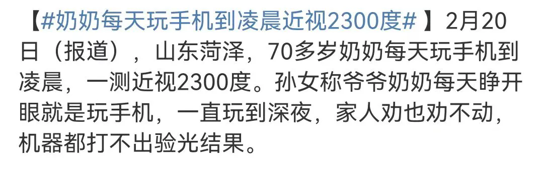 2月20日,山東菏澤發(fā)生了一起引人關(guān)注的健康事件:一位70多歲的老奶奶因長時(shí)間沉迷手機(jī),導(dǎo)致近視度數(shù)竟高達(dá)2300度。