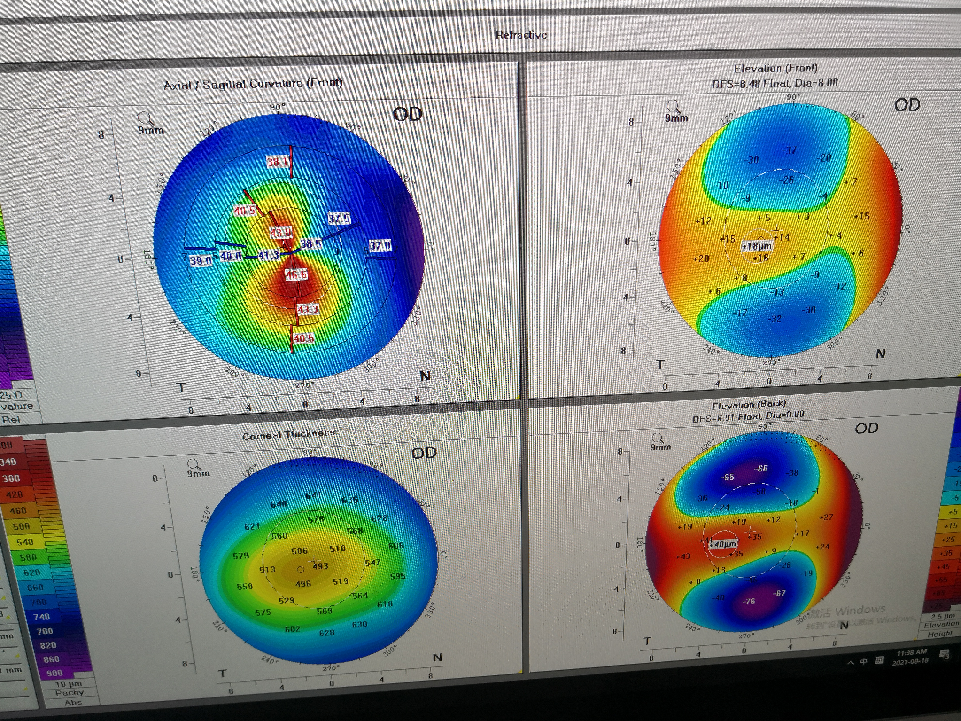 初期:這個時期的圓錐角膜,近視度數(shù)會不斷加深,同時散光和不規(guī)則散光度數(shù)也會逐漸增加,散光相較于近視會更明顯。